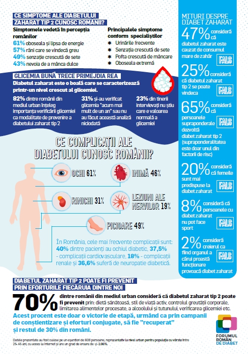 - 25% dintre românii din mediul urban au afirmat, în mod eronat, că diabetul zaharat se poate vindeca și doar 3 din 5 cunosc care este organul a cărui funcționare deficitară duce la diabet zaharat (pancreasul)