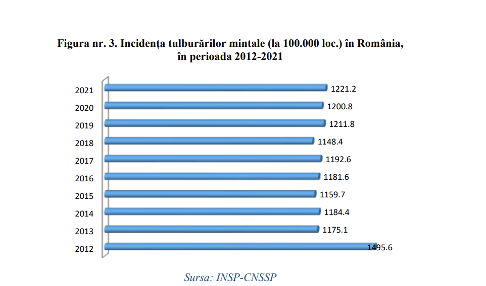 - Conform INSP, in anul 2021 aveam 232.000 cazuri existente de tulburari mintale si de comportament carora in fiecare an li se adauga aproximativ 250.000 cazuri noi