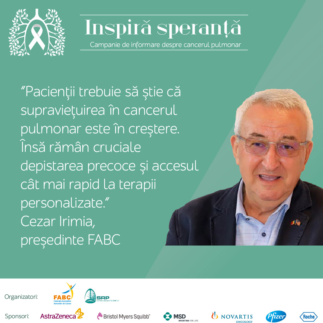 „În cancerul pulmonar, șansele de vindecare sunt cu atât mai mari cu cât este descoperit mai devreme, într-un stadiu minim de dezvoltare. Dar și în formele inoperabile de cancer pulmonar, cu metastaze, s-au făcut progrese terapeutice importante, care prelungesc viața pacientului oncologic. Deci există speranță, iar pacienții trebuie să știe că supraviețuirea în cancerul pulmonar este în creștere. Însă rămân cruciale atât depistarea precoce, prin screening, cât și accesul cât mai rapid la terapii personalizate“, spune Cezar Irimia, președintele FABC.