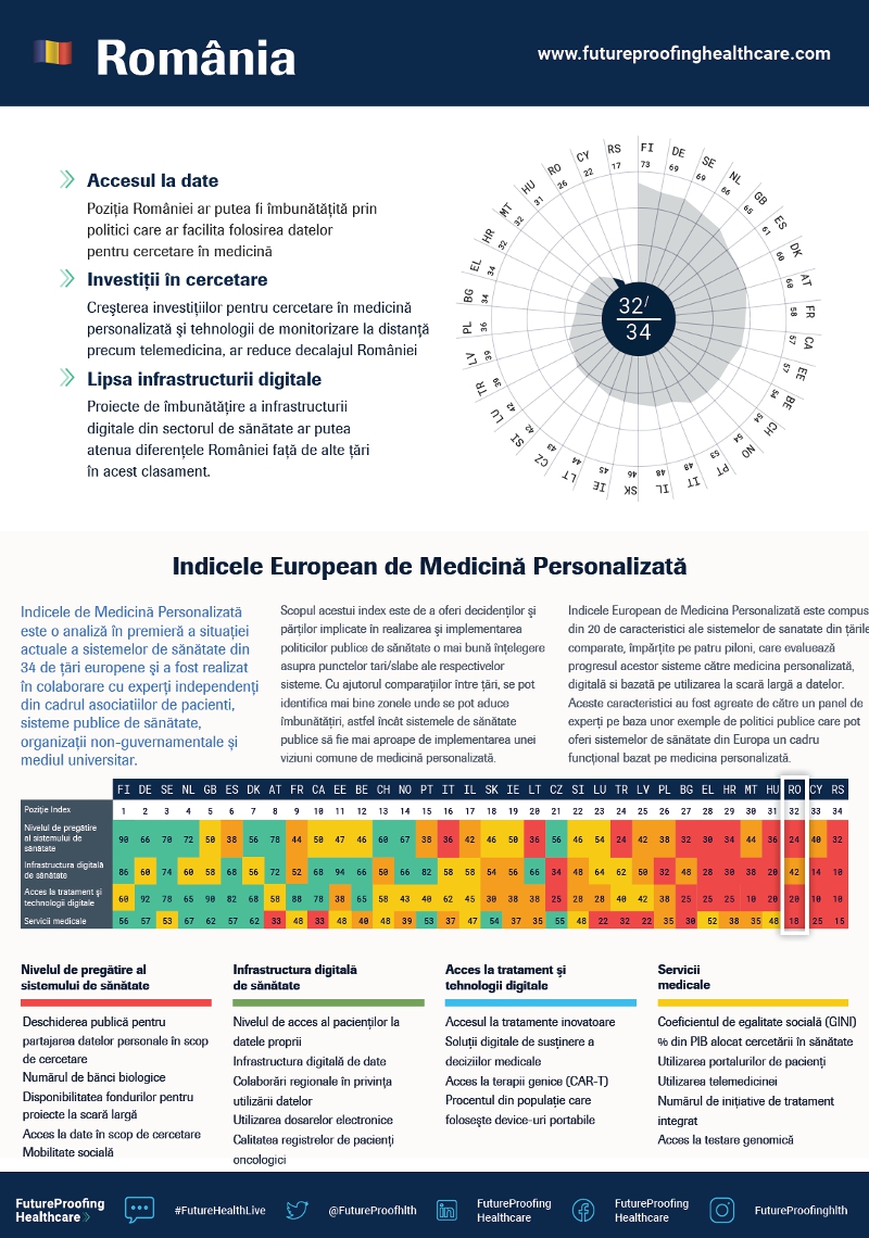România ocupă poziția 32 din 34 de țări europene, în cadrul Indicelui European de Medicina Personalizată, o analiză în premieră a sistemelor de sănătate. Studiul este realizat de către FutureProofing Healthcare, o inițiativă sprijinită de Roche și creată de experți independenți în sisteme de sănătate, cu scopul de a facilita discuții și proiecte necesare pentru a pregăti sistemele de sănătate publice din Europa pentru provocările medicinei personalizate.