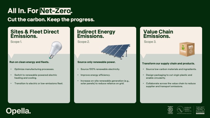 Pornind de la nivelul de referință din 2023, Opella se angajează să reducă emisiile de carbon cu 58,8% până în 2034, acoperind toate ariile — domeniile 1, 2 și 3 ale emisiilor de carbon. Până în 2050, compania își propune o reducere absolută de 90% a emisiilor. Aceste obiective vizează emisiile generate atât de operațiunile proprii, cât și de întreg lanțul valoric, iar eforturile de decarbonizare profundă vor fi prioritizate în detrimentul dependenței de mecanisme de compensare.