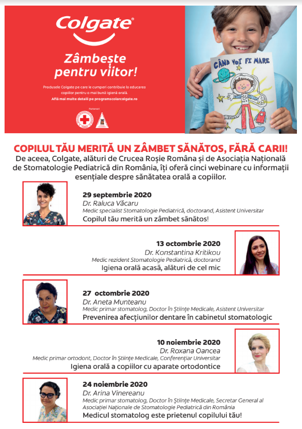 Copiii merită zâmbete sănătoase, fără carii. De aceea, Colgate România, împreună cu Societatea Națională de Cruce Roșie din România și Asociația Națională de Stomatologie Pediatrică din România lansează campania „Zâmbește pentru viitor”. În cadrul campaniei, părinții sunt invitați să participe la cinci webinare gratuite, susținute de medici stomatologi pediatri și ortodonți, pentru a descoperi informații actuale despre sănătatea orală a copiilor.