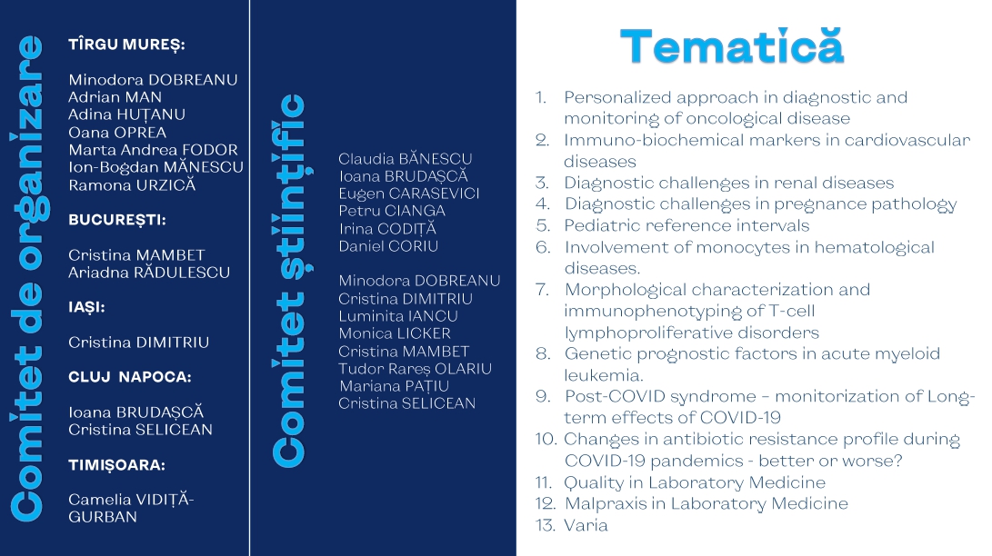 Pentru colegii din mediul universitar conferința oferă o bună oportunitate de a-și prezenta rezultatele cercetărilor. Rezumatele vor fi publicate în Revista Română de Medicină de Laborator (indexată Clarivate Analytics, cu factor de impact).