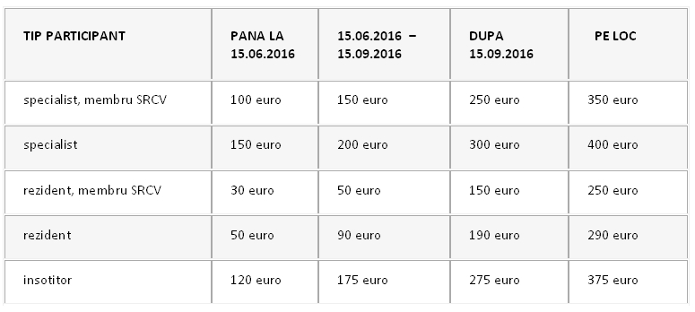 Valoarea taxei difera in functie de tipul de participant si termenul in care este platita, conform tabelului de mai jos: