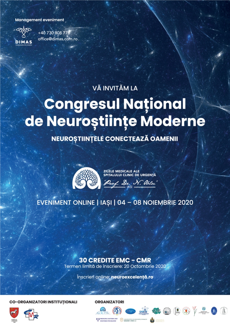 Spitalul Clinic de Urgență „Prof. Dr. N. Oblu” Iași, Societatea Română de Neurochirurgie, Societatea Română de Oftalmologie, Societatea de Neurologie din România, Societatea de Neuroradiologie și Radiologie Intervențională din România, Societatea Română de Neurooftalmologie, Societatea Română de Anatomie, Universitatea de Medicină și Farmacie „Gr. T. Popa” Iași, Asociația AntiParkinson România, Grupul AntiParkinson Laleaua Iașiului, Academia de Științe Medicale, Universitatea “Alexandru Ioan Cuza” Iași, Universitatea Tehnică „Gheorghe Asachi” din Iași, Asociația Bridging Eastern and Western Psychiatry România, Ateneul Național din Iași și Colegiul Medicilor din România, au deosebita onoare și plăcere de a vă invita să participați la lucrările online a celei de a doua ediții a Congresului de Neuroștiințe Moderne.