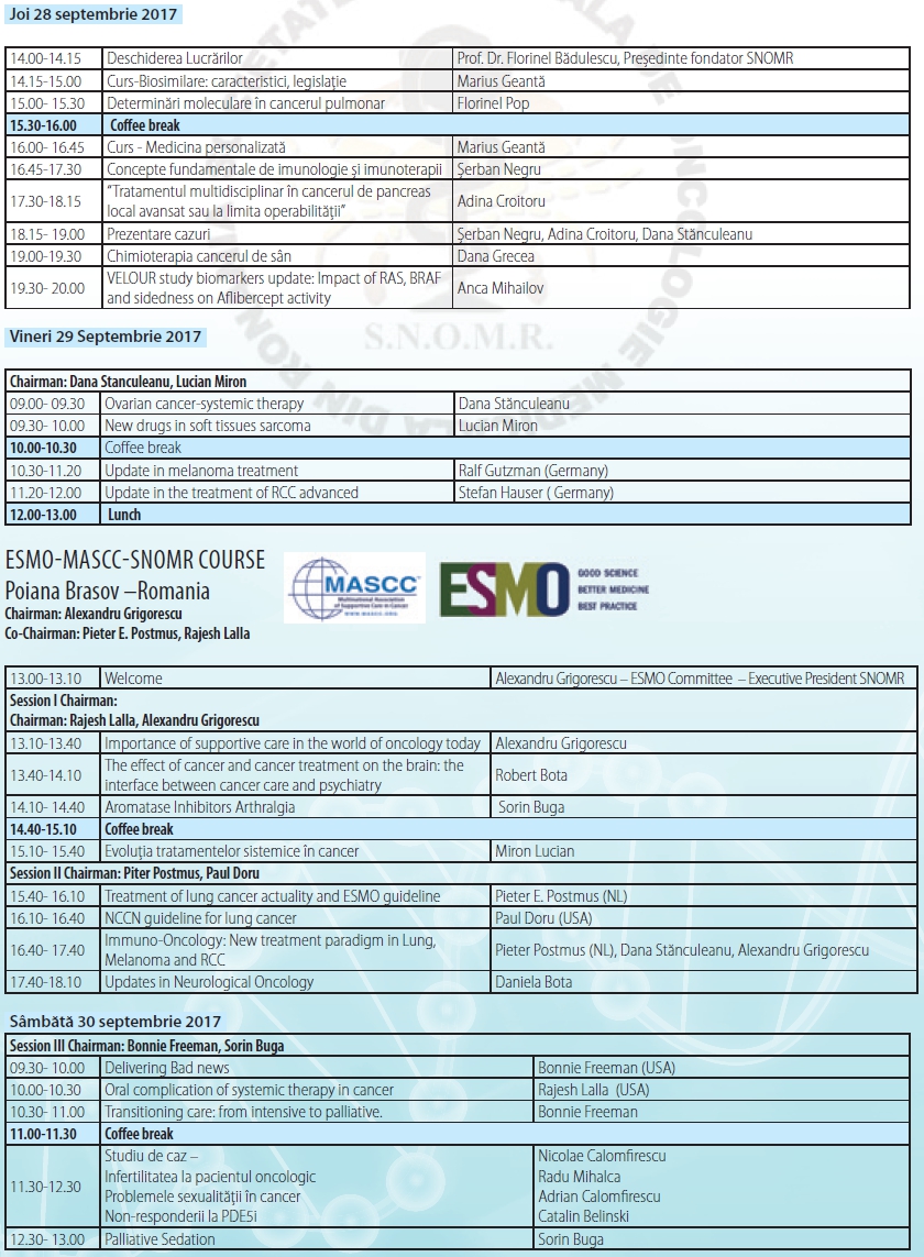 Organizator: http://snomr.ro/event/conferinta-nationala-de-oncologie-medicala-editia-a-17-a-28-septembrie-1-octombrie-2017-hotel-sport-poiana-brasov/