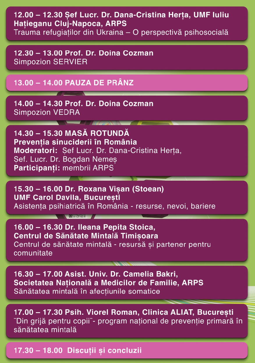 Conferința online – „NU EXISTĂ SĂNĂTATE FĂRĂ SĂNĂTATE MINTALĂ” din cadrul “MARATONULUI DE PREVENȚIE AL COMPORTAMENTULUI SUICIDAR ÎN ROMÂNIA”, 08 Octombrie 2022, in colaborare cu Dna Prof. Dr. Doina Cozman.