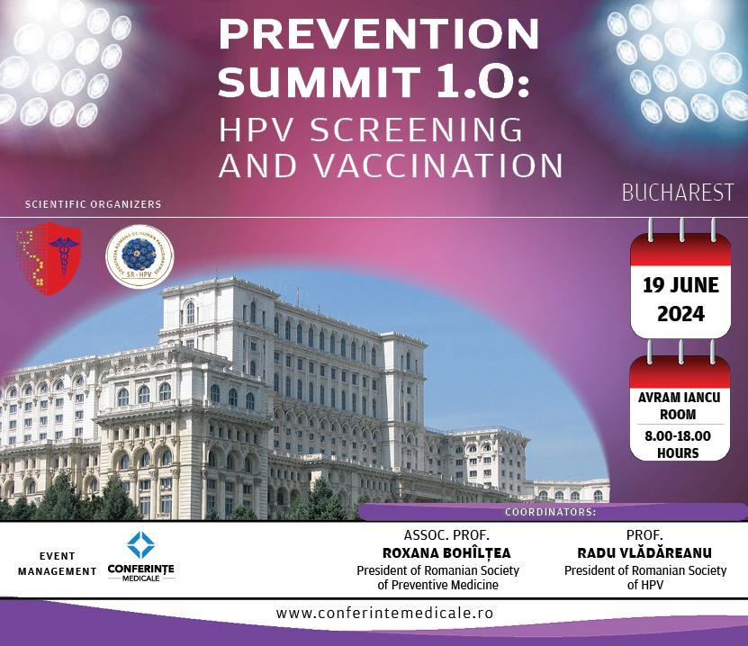 Societatea Română de Medicină Preventivă (SRMP) și Societatea Română de HPV au plăcerea de a anunța organizarea Summitului 1.0 pentru Prevenția HPV: Screening și Vaccinare, un eveniment de importanță majoră dedicat sănătății publice și prevenției cancerului. Evenimentul se va desfășura la Palatul Parlamentului, Sala Avram Iancu, intrarea A1 (Senatul României), între orele 08:00 și 18:00.