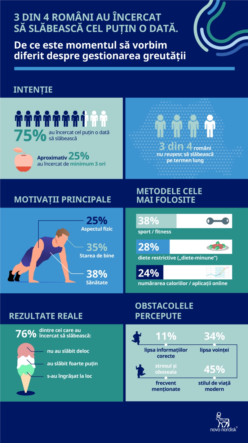 Obezitatea este una dintre cele mai mari provocări de sănătate ale prezentului, cu impact major asupra sănătății fizice, mentale și emotional. Datele din România, completate de rezultatele studiului european realizat la inițiativa Novo Nordisk, susțin nevoia unei schimbări de perspectivă in societate: de la soluții rapide, presiune individuală și mitul „voinței”, către o conversație informată, care recunoaște obezitatea ca boală cronică și pune accent pe sprijin medical, susținere pe termen lung și empatie. Dincolo de rezoluțiile de moment, gestionarea greutății trebuie privită ca un proces care nu ar trebui parcurs în solitudine.