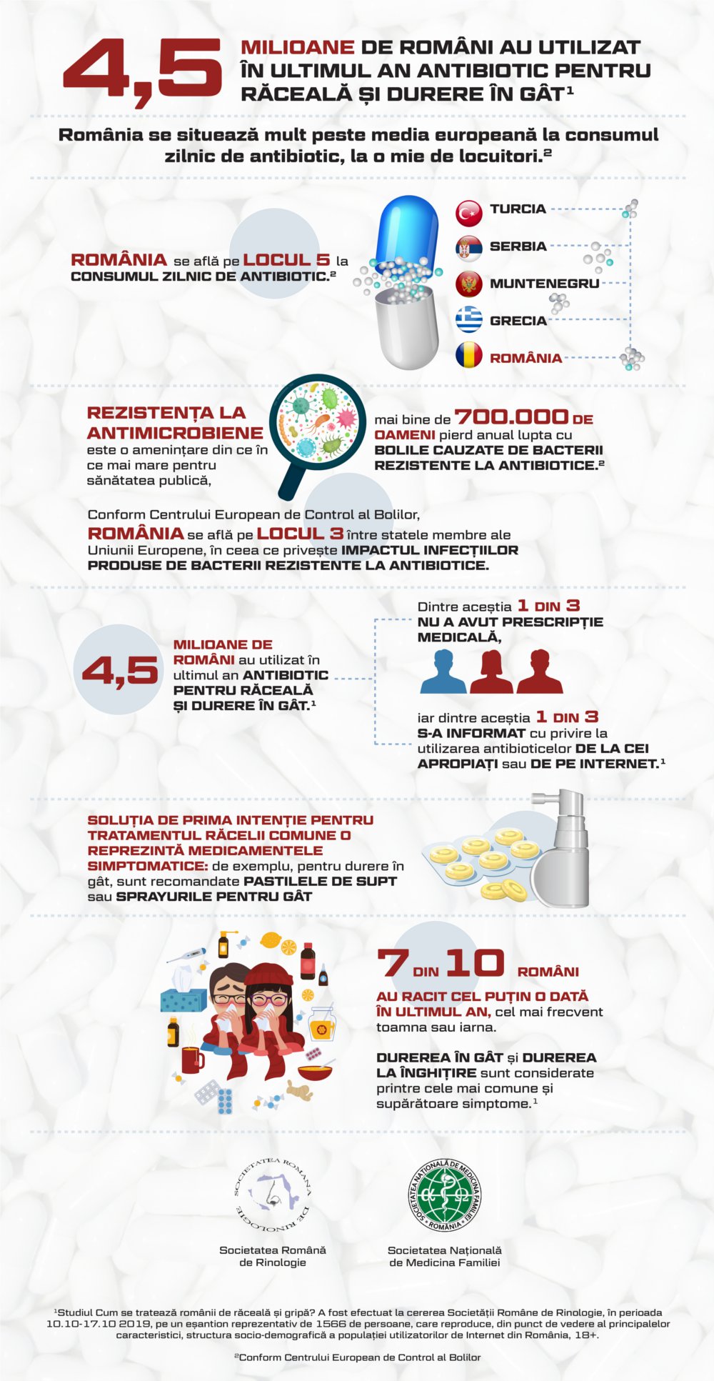 Românii sunt fruntași în automedicația cu antibiotice, arată un studiu nou* al Societății Române de Rinologie și Societății Naționale de Medicina Familiei, realizat în luna octombrie a acestui an: peste 4.5 milioane de români au tratat în ultimul an cel puțin o dată răceala manifestată cu durere în gât cu antibiotice și peste 30% dintre ei au făcut acest lucru fără niciun fel de recomandare de la medic. O treime dintre cei care au consumat antibiotic fără prescripție de la medic s-au documentat cu privire la utilizarea antibioticelor, apelând la sfaturile celor apropiati sau citind pe Internet.