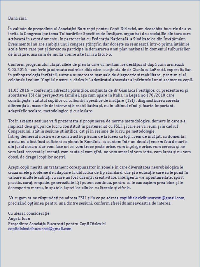Mai jos aveti scrisoarea dnei Angela Ioan, Presedinta Asociatiei Bucuresti pentru Copii Dislexici si atasat, invitatia si programul. Asteptam confirmarile dvs. aici si pe adresa:copiidislexicibucurest@gmail.com