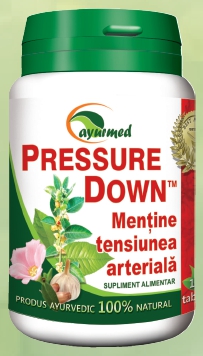 Suplimentul alimentar PRESSURE DOWN tablete, conține plante medicinale ayurvedice care contribuie la menținerea unei tensiuni arteriale sănătoase, factor important în menținerea sănătății sistemului cardio-vascular și altor organe care la randul lor influențează tensiunea arterială. Contribuie la menținerea sănătății și a funcționării normale a inimii prin creșterea puterii de contracție, a randamentului mușchiului cardiac, normalizarea ritmului bătăilor inimii, asigurând astfel o tensiune normală. Contribuie la o circulație sănătoasă și la o tensiune arterială în limite normale prin menținerea elasticității și structurii vaselor de sânge. Susține sănătatea vaselor sistemului circulator prin menținerea nivelului și raportului normal al lipidelor din sânge prin creșterea metabolizării și eliberarea de energie. PRESSURE DOWN susține eliminarea excesului de apă din organism ceea ce duce la normalizarea volumului plasmatic și a tensiunii arteriale. Menține capacitatea de adaptare a organismului la stres fizic și psihic persoanelor suprasolicitate și vârstnicilor, reducând stresul psihic care poate declanșa hipertensiune arterială, insomnie, oboseală, angină pectorală, îmbătrânirea prematură. Susține sistemul imunitar și sistemul antioxidant endogen, crescând rezistența și capacitatea organismului de adaptare la condiții de stres.