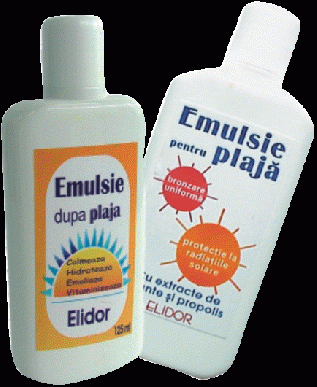 După sfârşitul expunerii solare recomandăm utilizarea de EMULSIE DUPĂ PLAJĂ (ELIDOR) care datorită extractelor şi uleiurilor naturale conţinute (ulei de jojoba şi cătină, extract de Centella Asiatica, beta-caroten şi vitaminele A, C, E) asigură calmarea pielii iritate, emoliază, hidratează, vitaminizează, redă fermitatea şi asigură un efect antiageing.