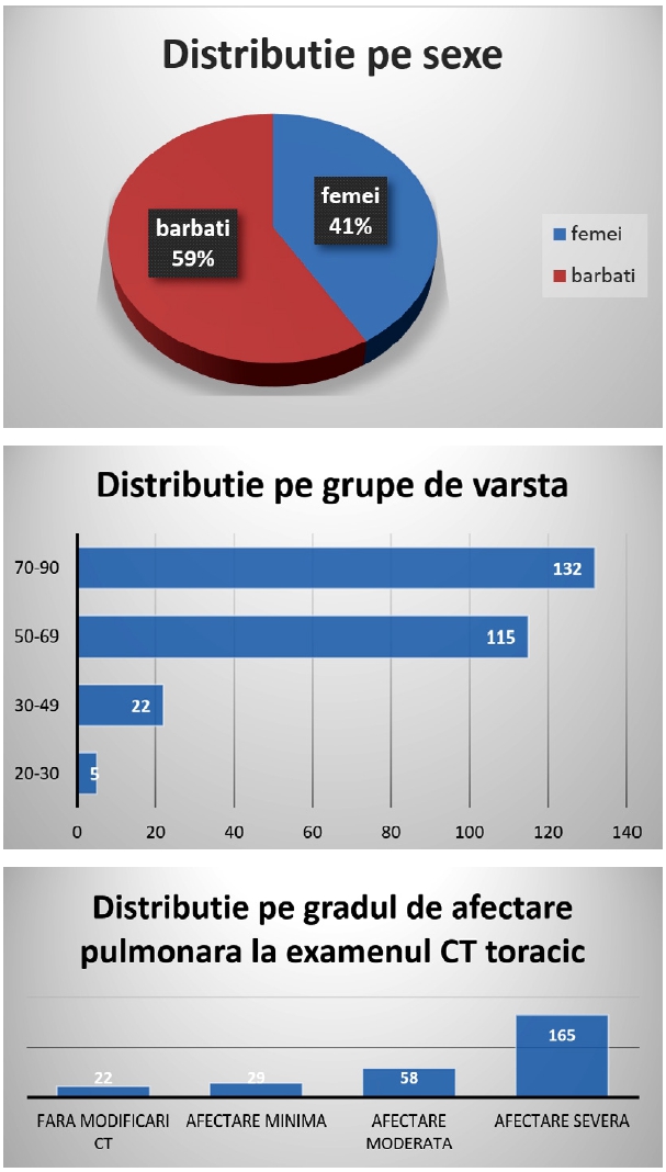 În cadrul Spitalului Clinic de Urgență „Prof. Dr. N. Oblu” Iași, examinările CT a toracelui au fost efectuate cu pacientul în decubit dorsal, cu mainile deasupra capului, întinse, în inspir; în perioada aprilie - septembrie 2020 au fost examinați prin computer-tomografie de torace un număr de 276 de pacienți cu infecție cu SARS COV-2, care au avut caracteristicile următoare (Graficul 1,2, 3):