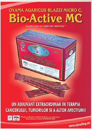 Notă: Bio Active MC este un supliment alimentar şi nu înlocuieşte tratamentul recomandat de medic sau un regim alimentar variat. Rezultatele diferă în funcţie de organismul fiecărei persoane, dar este întru totul natural şi ajută la buna funcţionare a organismului. De asemenea, prin bogatul conţinut de Beta-D-Glucan, luptă cu celulele canceroase. Vă recomandăm să îl achiziţionaţi din punctele autorizate de pe site-ul nostru, pentru a beneficia de sfat autorizat de administrare.