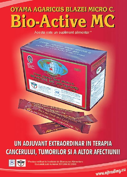 Notă: Bio Active MC este un supliment alimentar şi nu înlocuieşte tratamentul recomandat de medic sau un regim alimentar variat. Rezultatele diferă în funcţie de organismul fiecărei persoane, dar este întru totul natural şi ajută la buna funcţionare a organismului. De asemenea, prin bogatul conţinut de Beta-D-Glucan, luptă cu celulele canceroase. Vă recomandăm să îl achiziţionaţi din punctele autorizate de pe site-ul nostru, pentru a beneficia de sfat autorizat de administrare.