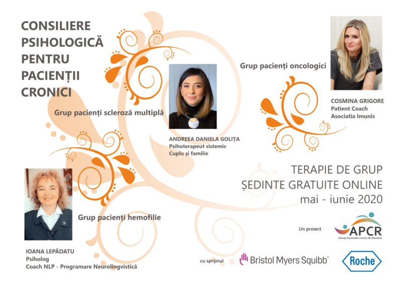 Alianța Pacienților Cronici din România (APCR), cu sprijinul Bristol Myers Squibb și Roche România le oferă cadrul de a-și exprima aceste temeri și a primi răspunsuri la întrebările lor. Începând de marți 12 mai, pacienții cu afecțiuni cronice neurodegenerative (scleroză multiplă), hematologice (hemofilie) sau oncologice (cancer) au la dispoziție consiliere psihologică gratuită în cadrul unor ședințe online de terapie de grup la care se pot înscrie AICI.