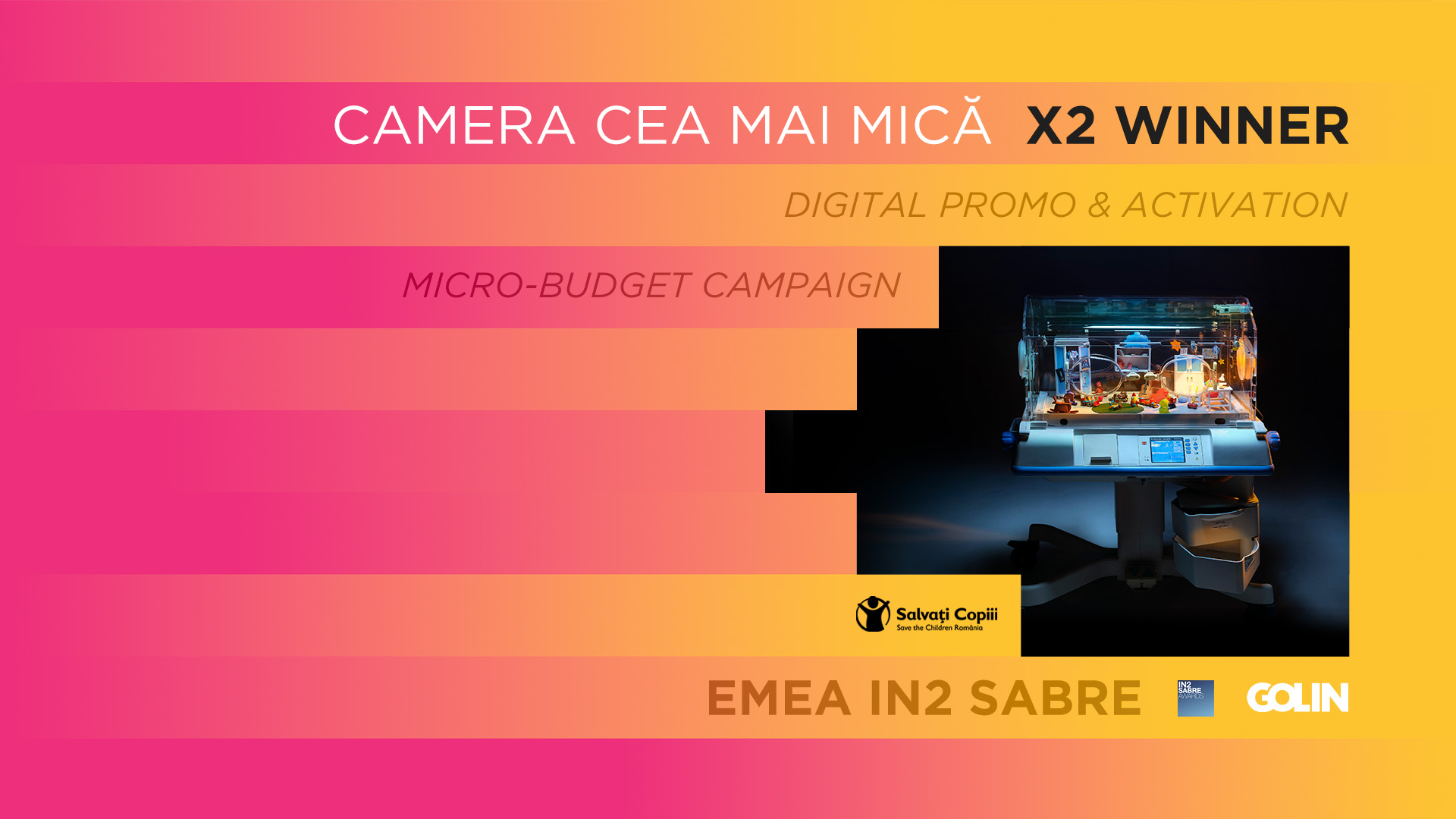 Golin România câștigă la IN2 SABRE Awards, obținând premiul categoriei Digital Promo & Activation și un Certificat de excelență la categoria Micro-Budget Campaign cu campania „Camera cea mai mică”, realizată pentru Salvați Copiii România.