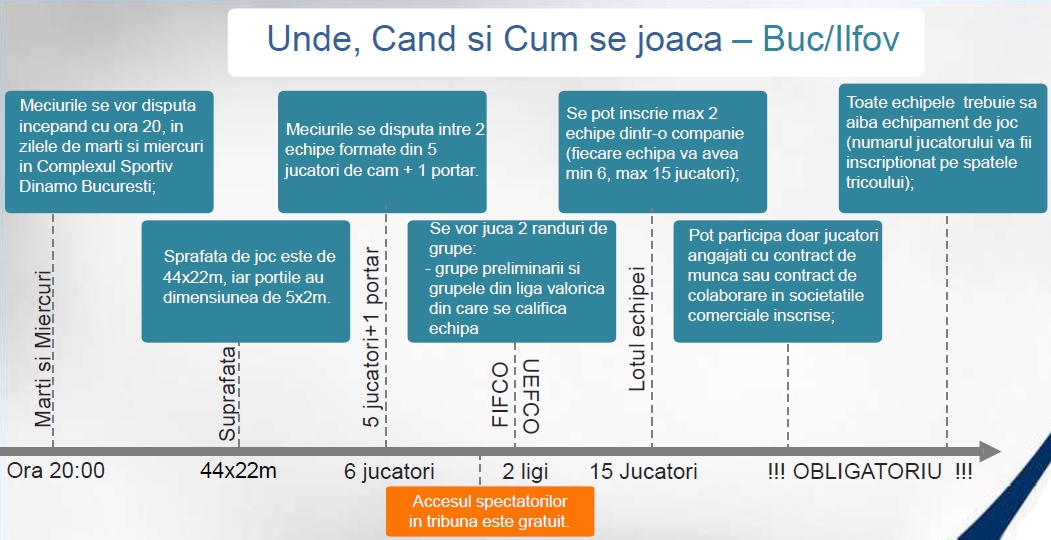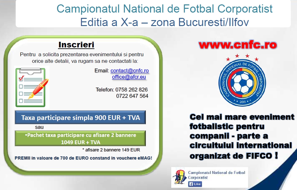Va invitam sa participati cu echipa companiei dumneavoastra la cel mai mare turneu sportiv din Romania, dedicat sportului corporatist. Campionatul National de Fotbal Corporatist (fosta  Cupa “CORNEL DINU” pentru companii), este un team building sportiv, in cadrul caruia angajatii companiilor concureaza pe durata a 3 luni (martie – iunie ), in incercarea de a castiga prestigiosul trofeu. Turneul reprezinta o buna oportunitate de a interactiona cu actualii clienti sau viitori parteneri. Organizat in sistem  primavara – toamna, Campionatul National de Fotbal Corporatist, a reusit sa creasca de la an la an, nu mai putin de 165 de companii participand doar in zona Bucuresti/Ilfov (lista completa o gasiti mai jos sau in prezentarea atasata). Dupa ocuparea ultimelor 3 locuri ramase disponibile, vom anunta componenta completa a tabloului participantilor la cea de-a X-a editie.