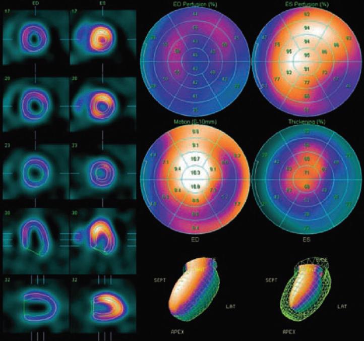 Tomoscintigrafia miocardică de perfuzie  (SPECT) sincronizată ECG (Gated-SPECT) permite analizarea în trei dimensiuni a perfuziei miocardice, iar prin cuplarea cu ECG, evaluarea contractilităţii (cineticii) miocardice segmentare şi globale a ventriculului stâng, cu determinarea parametrilor funcţionali ai VS, în condiţii de repaus şi de stress (bicicleta ergonomică/banda de  alergare, stress farmacologic).