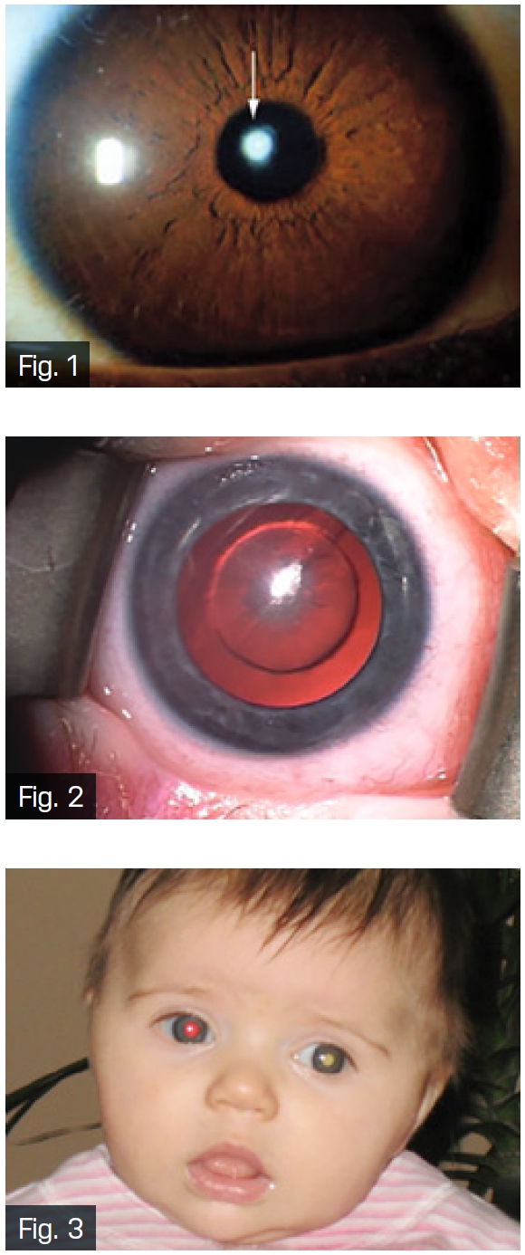 Toți non-născuții ar trebui supuși unui screening, evaluându-se reflexul roșu al fundului de ochi. Copilul cu cataractă poate avea un reflex pupilar albicios în loc de roșiatic (Fig. 3). Cataracta unilaterală poate induce ambliopie (ochi leneș) sau strabism, iar cea bilaterală mișcări anormale ale ochilor (nistagmus). Uneori glaucomul poate fi asociat.