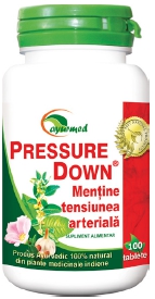 PRESSURE DOWN® - Fitocompus din plante medicinale ayurvedice ce contribuie la menținerea tensiunii arteriale în limite normale prin menținerea elasticității și structurii vaselor sanguine. Menține circulația sanguină coronariană și sistemică în parametri optimi. Elimină excesul de apă din organism. Menține raportul normal al lipidelor din sânge prin creșterea metabolizării lor. Substanțele bioactive susțin capacitatea de adaptare a organismului la stres fizic și psihic reducând astfel riscul de: hipertensiune arterială, insomnie, oboseală, îmbătrânire prematură.
