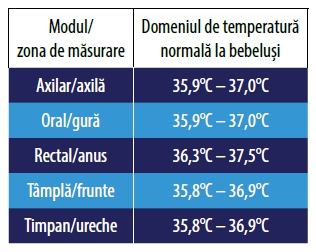Temperatura normală a unui bebeluș, depinzând de locul unde efectuăm măsurătoarea, este prezentată în tabelul de mai sus: