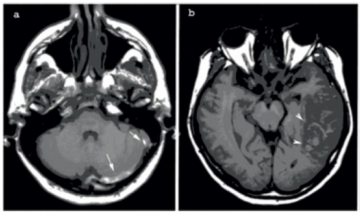 În cazul trombozei venelor cerebrale interne poate apare zone de infarctizare la nivelul trunchiului cerebral, talamusului, hipotalamusului, corpului calos şi cerebelului.