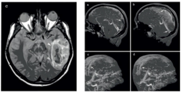 IRM reprezintă metoda de elecţie, având sensibilitate crescută pentru vizualizarea directă a trombului intrasinusal şi pentru demonstrarea răsunetului parenchimatos al obstrucţiei venoase (2). Modificările de semnal depind de stadiul trombozei şi sunt în corelaţie cu stadiul de degradare al hemoglobinei: