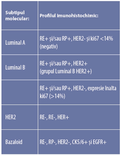 Trei markeri imunohistochimici sunt folosiţi în practică clinică pentru clasificarea moleculară a cacinomului mamar: receptorii estrogenici (RE), receptorii progesteronici (RP) şi expresia HER2.