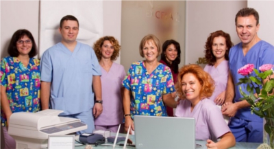 Echipa stomatologică este alcătuită din 9 medici specializați în țară și în străinătate și este coordonată de către Dr. Adriana Lucia Celebidache, medic primar dentist, specialist în estetică dentară, certificare Lumineers, unul dintre primii 15 români specializați în tehnologia stomatologică laser (Master Laser Dentistry, 2016 - Universitatea Aachen, A.A.L.Z., Germania). Datorită investițiilor realizate de-a lungul anilor în achiziția de lasere și în pregătirea medicilor în utilizarea lor, aproximativ 90% dintre tratamentele dentare acordate în cadrul clinicii sunt realizate prin această metodă, inclusiv tratamentul cariei și parodontoza. Avantajele terapeutice sunt numeroase, de la reducerea timpului de tratament și a numărului de ședințe, reducerea durerii și disconfortului, sterilizarea în procent de 99,9% a zonei tratate (față de 60% în tratamentele clasice), până la împiedicarea recidivelor afecțiunilor și vindecarea mai rapidă a țesuturilor.