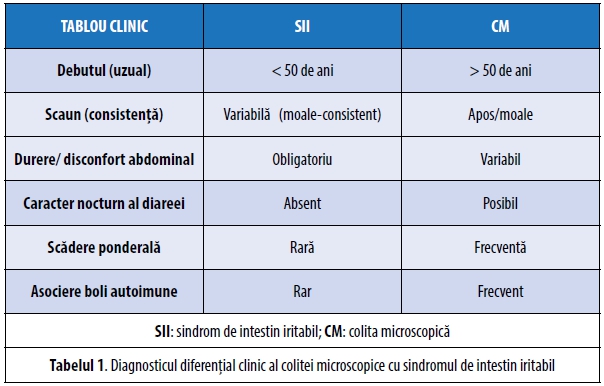Un aspect care merită dezvoltat este diagnosticul diferențial între colita microscopică și sindromul de intestin iritabil. Durerea abdominală este frecventă în colita microscopică, totodată se consideră că până la o jumătate dintre pacienții cu colită microscopică îndeplinesc criteriile de diagnostic pentru sindromul de intestin iritabil. Pe de altă parte, 10% dintre pacienții încadrați ca sindrom de intestin iritabil au de fapt colită microscopică. Ca simptome comune care pot alimenta suprapunerea, pot fi amintite astenia, depresia; totuși, există anumite trăsături distincte care pot ajuta în diagnosticul diferențial (Tabelul 1).