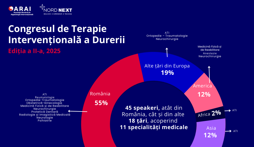 18 țări, acoperind 11 specialități medicale, care au adus în prim-plan inovațiile în terapia durerii intervenționale – un domeniu medical inovator, dedicat tratamentului minim invaziv al durerii cronice și acute. La eveniment au participat peste 180 de specialiști din diverse specialități medicale, consolidându-se, astfel, o platformă de schimb de cunoștințe și de colaborare multidisciplinară – Anestezie și Terapie Intensivă, Reumatologie, Ortopedie-Traumatologie, Obstetrică-Ginecologie, Medicină Fizică și de Reabilitare, Neurochirurgie, Protetică Dentară, Radiologie și Imagistică Medicală, Neurologie, Psihiatrie.