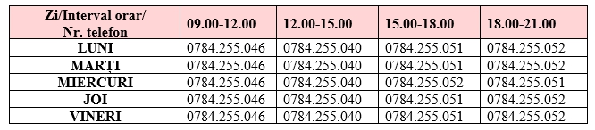 Pentru a apela la serviciul de suport și consiliere psihologică Psiho-Assist puteți suna la numerele de telefon puse la dispoziție în orarul afișat mai jos: