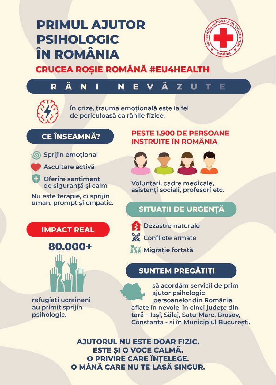 Programul care a permis construirea acestei rețele de oameni instruiți în acordarea de prim-ajutor psihologic s-a numit #EU4Health și a fost finanțat de Comisia Europeană care a investit 1 milion de euro în România pentru promovarea sănătății mintale. În iunie 2022, cu sprijinul programului #EU4Health, Federația Internațională a Societăților de Cruce Roșie și Semilună Roșie (IFRC) și Centrul Internațional de Referință pentru Sănătate Mintală și Sprijin Psihosocial (MHPSS Hub) al Mișcării de Cruce Roșie și Semilună Roșie (RCRC) au lansat proiectul „Furnizarea de prim-ajutor psihologic de calitate și la timp, persoanelor afectate de criza din Ucraina”.
