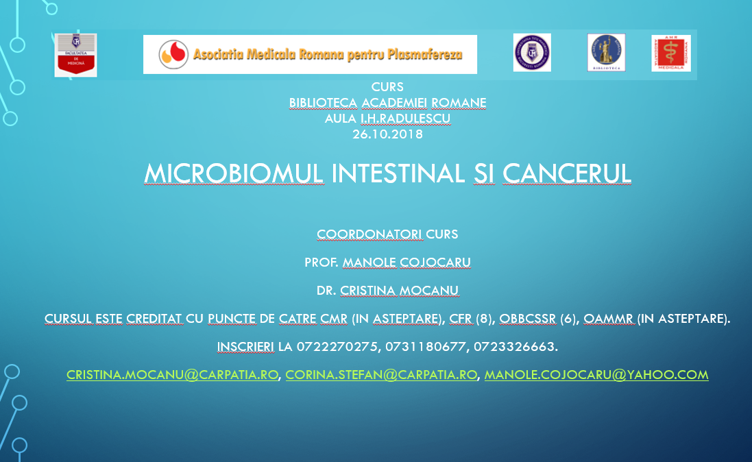 - 26.10.2018 la Cursul 5 de Medicina Integrativa "Microbiomul intestinal si cancerul."