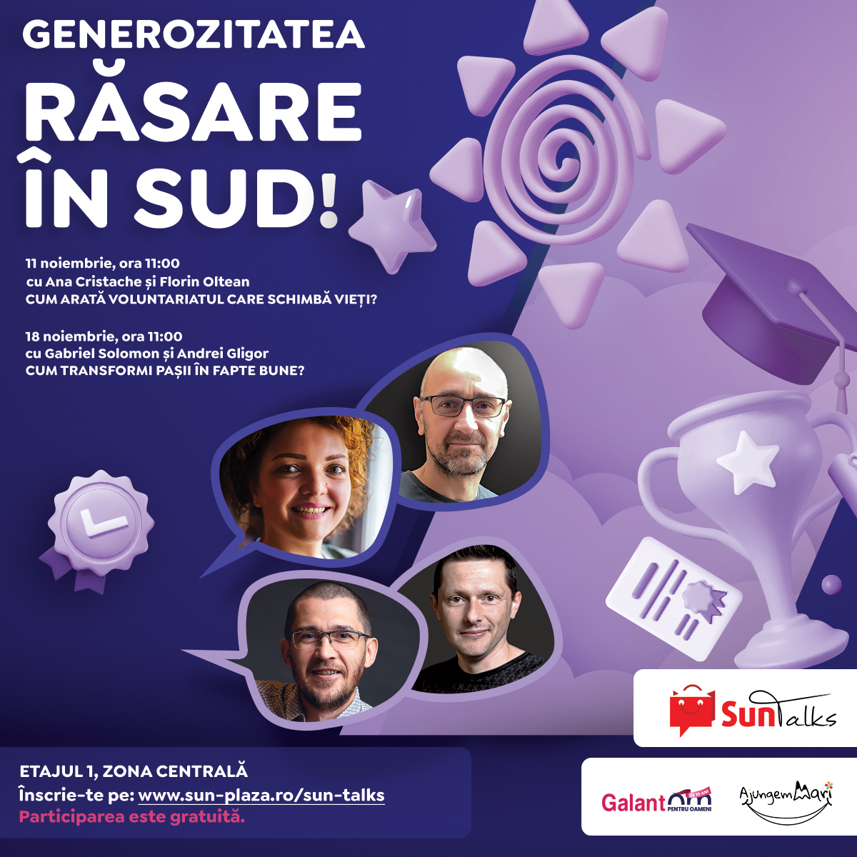 adresa https://www.sun-plaza.ro/sun-talks. Persoanele înscrise sunt rugate