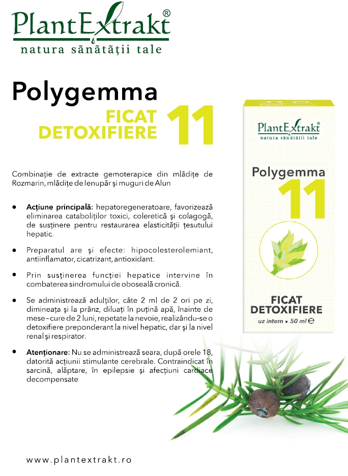 Putem apela la preparatul gemoterapic complex, Polygemma11-Ficat detoxifiere, o combinație de gemoterapice din mlădițe de Rozmarin, Ienupăr și muguri de Alun, care se poate consuma preventiv timp de 1-2 luni, de 3-4 ori/an, pentru cei cu steatoză hepatică sau o dată pe an pentru cei sănătoși, având efect regenerator al celulei hepatice, de stimulare a secreției și eliminării de bilă și de restaurare a elasticității țesutului hepatic.