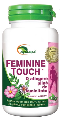 FEMININE TOUCH este un supliment alimentar, marca AYURMED, care conţine un amestec de plante medicinale indiene renumite pentru aportul optim de fitohormoni, ce menţin structura, elasticitatea şi dimensiunea sânilor în mod armonios. Substanţele bioactive din plante au efect regenerant şi tonic asupra aparatului genital feminin, susţinând echilibrul hormonal, aspectul şi dimensiunea sânilor, desfăşurarea normală a funcţiilor sexuale şi menţinerea echilibrului psihic al femeii pe termen lung. Contribuie la o bună funcţionare a glandelor mamare, în special în perioada de lactaţie cu menţinerea cantităţii şi calităţii laptelui. FEMININE TOUCH sprijină desfăşurarea normală a proceselor digestive şi a celor responsabile de eliminarea apei din organism.