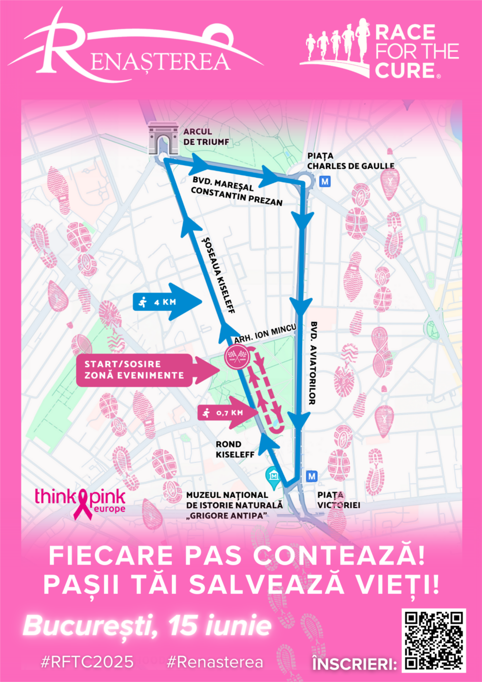 Cursa de alergare / plimbare 4 km sau de 0.7 km cu punct de Start/Sosire în Piațeta Regelui, Bd. Kiseleff, organizată de Fundația Renașterea sub sloganul ”FIECARE PAS CONTEAZĂ! PAȘII TĂI SALVEAZĂ VIEȚI!”, a pregătit nenumărate surprize pentru toți participanții și în mod special pentru învingătoarele în lupta cu cancerul, doamnele în tricouri roz.