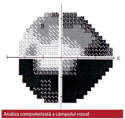 4. Examinarea câmpului vizual este investigaţia care stabileşte în ce măsură este afectată capacitatea pacientului de a vedea – în mod caracteristic, în glaucom se produce o îngustare a câmpului vizual dinspre periferie spre centru, apariţia de scotoame paracentrale, treaptă nazală până la insulă de vedere centrală.