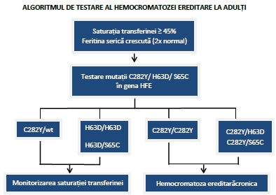 Formelor manifeste de hemocromatoză ereditara se asociază cu valori ale saturației transferinei ≥ 45% și a concentrației feritinei serice peste limita normala (i.e.,>300 ng/mL bărbați și >200 ng/mL femei).
