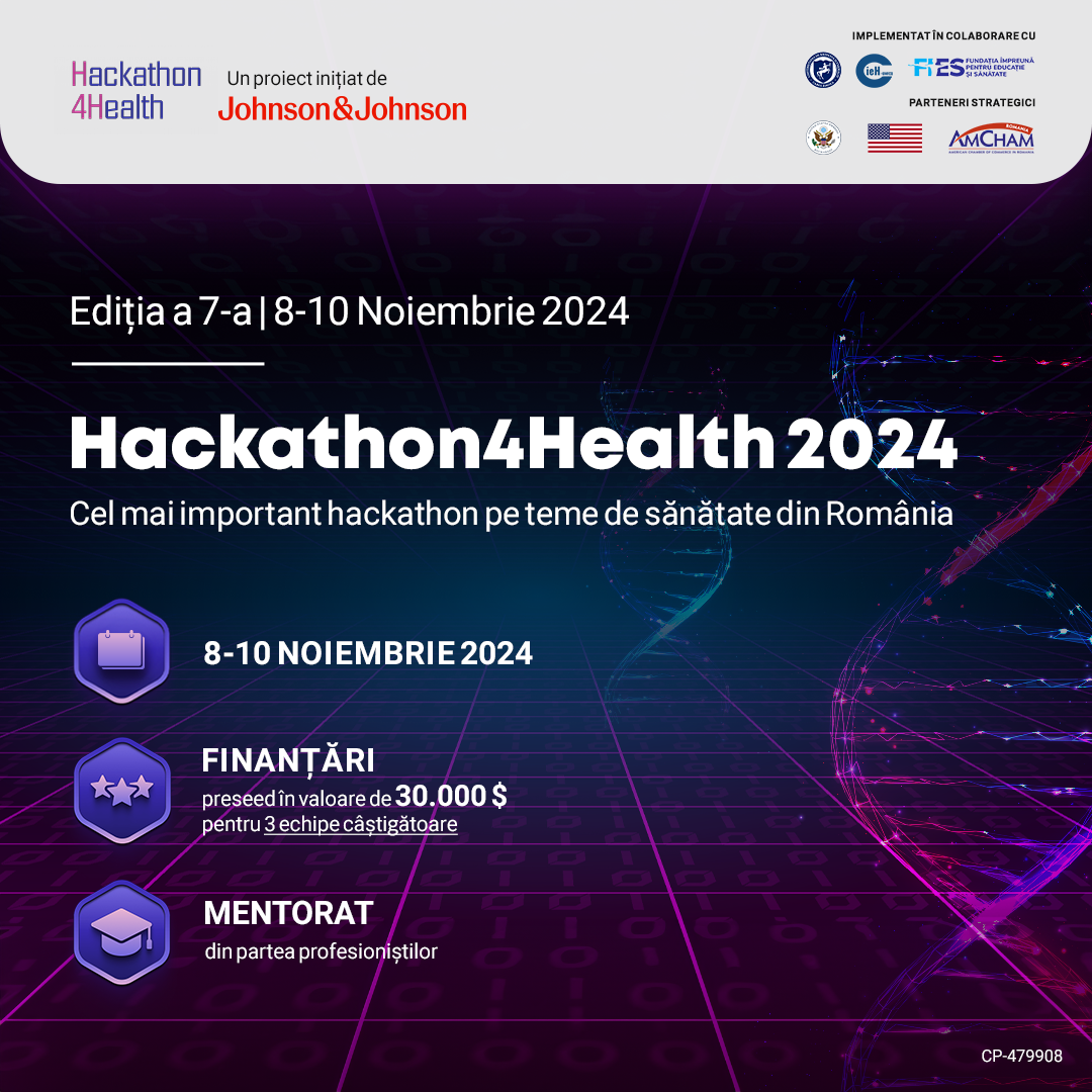 București, România (8 octombrie 2024) – Azi se dă startul înscrierilor în cadrul celei de-a 7a ediții a Hackathon4Health, un proiect inițiat de Johnson&Johnson România, implementat în colaborare cu UMFCD, prin Centrul de Inovație și e-Health și Fundația Împreună pentru Educație și Sănătate (FIES). Hackathon4Health, cel mai important hackathon pe teme de sănătate din România, va avea loc în perioada 8-10 noiembrie 2024 și va urmări identificarea și susținerea celor mai valoroase proiecte digitale inovatoare, cu impact real în domeniul sănătății. Trei echipe câștigătoare dintre cele participante la hackathon în urma procesului de selecție vor beneficia de finanțări pre-seed în valoare totală de 30.000 de USD din partea Johnson & Johnson România și mentorat pentru dezvolatrea proiectelor în primele 6 luni ulterioare finanțării, din partea Johnson & Johnson și a Universitatății de Medicină și Farmacie „Carol Davila” din București, prin intermediul Centrului de Inovație și e-Health.