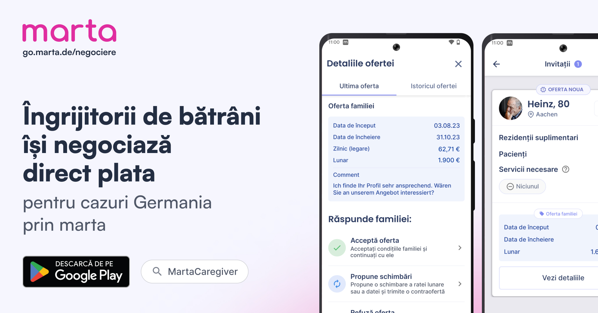 Platforma poate fi vizitată aici -> go.marta.de/negociere, aplicația poate fi descărcată de aici, iar consultanții marta pot fi sunați la 031 630 9967. Îngrijitorii pot să caute oferte de la familii și primesc sprijin 24/7 fără niciun cost.