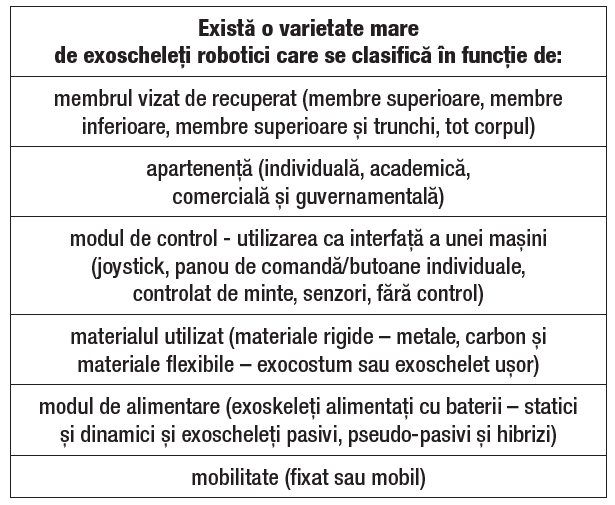 Pe piața medicală există mai multe tipuri de exoscheleți, dar datorită costurilor ridicate, a lipsei de decontare din partea asigurărilor publice și private și a modelului/modului de implementare (antrenament specific din partea manipulatorului), momentan utilizarea lor este redusă. Acest lucru asociat cu limitarea studiilor de tip cohortă, cu design diferit care să sublinieze ameliorarea calității vieții și sănătății, nu ar trebui să fie descurajator în introducerea acestei proceduri în recomandările de reabilitare a pacienților cu diferite deficite neuro-musculoscheletale.