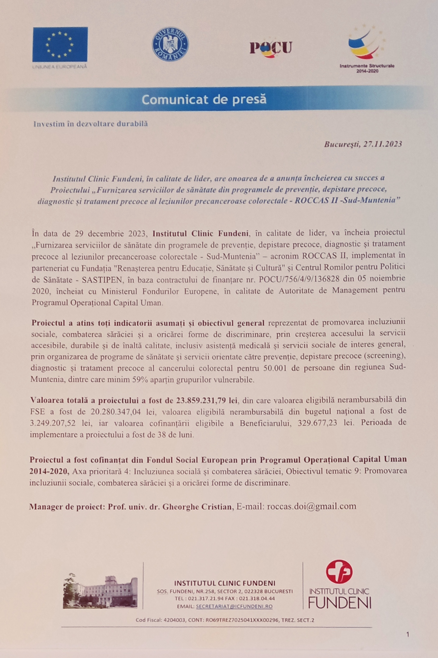 Proiectul ROCCAS a început în 2019 și se încheie în decembrie 2023; în proiectul ROCCAS II Sud - MUNTENIA prima persoană supusă screeningului a fost în noiembrie 2022 (între 2019-2022 a fost perioada de organizare a proiectului, am ţinut cursuri, s-au efectuat achiziţii și a fost perioada pandemică COVID), iar prima colonoscopie a fost efectuată în noiembrie 2023.