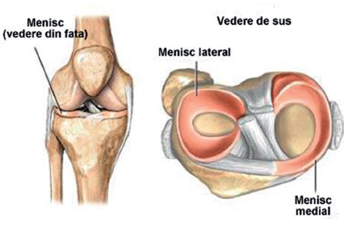 • meniscurile intern şi extern, se situează între suprafeţele articulare fiind două formaţiuni fibrocartilaginoase. Rolul lor este de a amortiza şocurile şi de stabilizare a genunchiului.