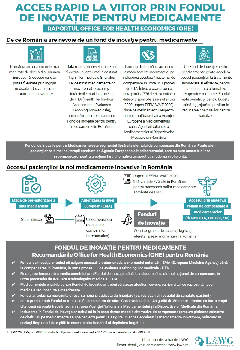 Inițiativa LAWG, demarată cu peste trei ani în urmă și care a cuprins mai multe etape consultative la nivel național cu actori importanți la nivel decizional, autorități și experți, are propuneri concrete de contracte, protocoale și modalități de compensare a medicamentelor prin acest Fond de Inovație și presupune o colaborare eficientă pe temen mediu și lung a tuturor partenerilor din mediul public-privat, pentru o cât mai bună coordonare și implementare a programului la nivel național. Lansarea unui fond de inovație în sănătate și acces rapid la tratamente inovatoare ar putea acoperi trei tipuri de medicamente: medicamentele care anterior obținerii autorizației de punere pe piață (APP) au fost aprobate în baza Ordinuli nr. 1018/2014, medicamente pentru care APP a fost eliberat în baza procedurii PRIME (Priority Medicine) de către Agenția Europeană a Medicamentului și medicamentele care dovedesc un grad ridicat de inovație și eficiență, care sunt evaluate de către ANMDMR în baza unei grile de criterii. Acestea pot reprezenta punctul de pornire, iar odată ce eficiența îi este confirmată și în măsura bugetului disponibil, Fondul de Inovație poate fi deschis și altor medicamente considerate inovatoare.