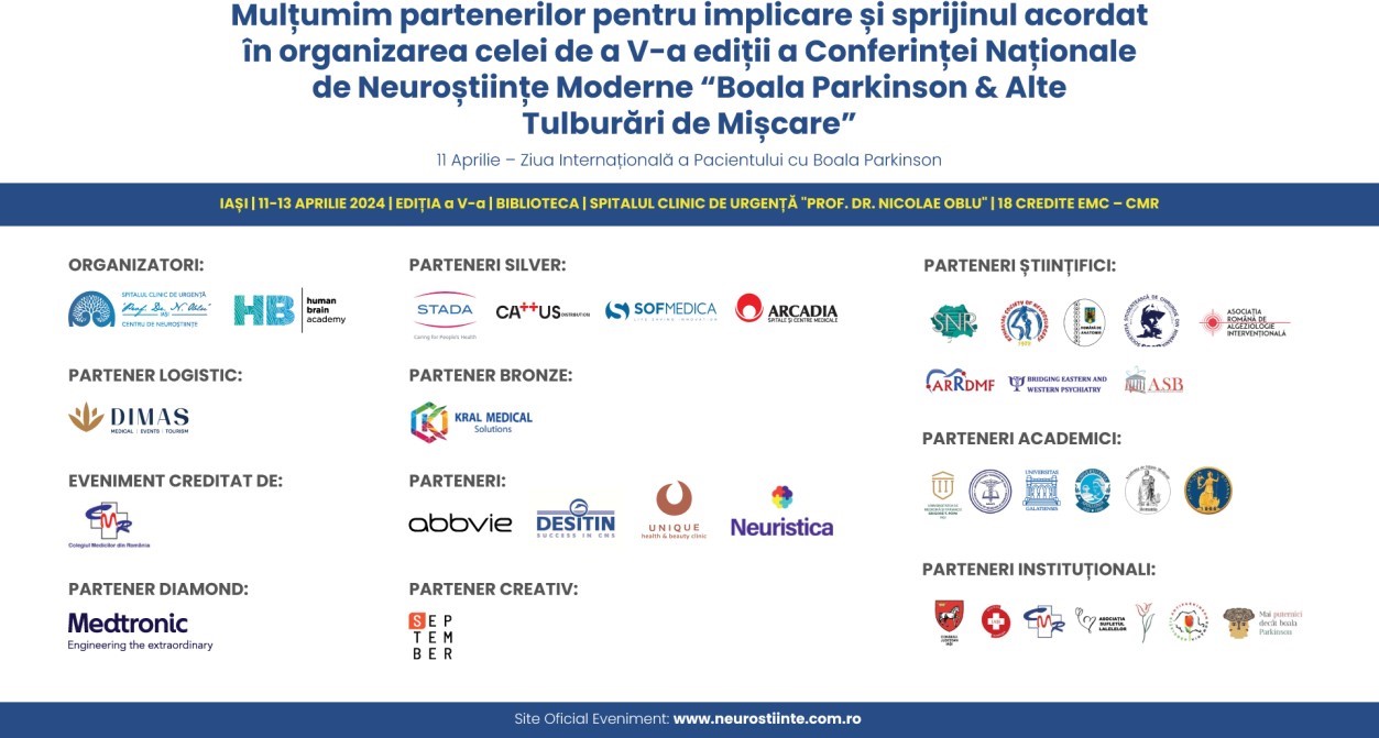 În perioada 11-13 Aprilie 2024 s-a desfăşurat la Iași, în cadrul Spitalului Clinic de Urgență „Prof. Dr. Nicolae Oblu” cea de-a 5-a ediţie a Conferinței Naționale de Neuroștiințe Moderne “Boala Parkinson & Alte Tulburări de Mișcare”, eveniment organizat în format Hybrid.