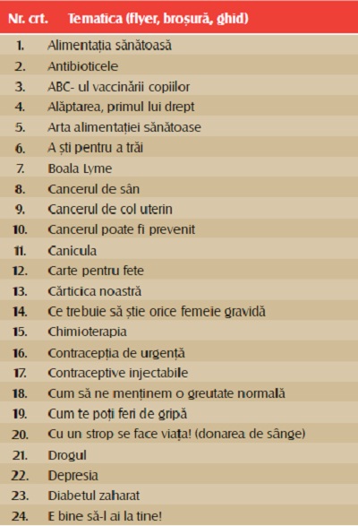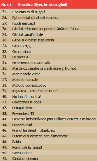 La nivelul Direcţiilor de Sănătate Publică există Compartimentul de Evaluare şi Promovare a Sănătăţii, care poate furniza materiale informative specialiştilor interesaţi. De exemplu, la Sibiu se promovează informarea cu tematici care acoperă un domeniu larg de interes, dar şi probleme actuale prioritare (boli a căror incidenţă a crescut şi care necesită un management pluridisciplinar mai eficient).